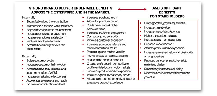 The full breadth of benefits from a strong, well-aligned brand drives significant, tangible financial returns, which is why leaders commit to building the brand as a strategic priority. For private equity, that value is realized in better performance, increased leverage, larger multiples, and greater transaction returns. This is a rising tide in private equity. If we can assess and score brand attributes, we can optimize them and leverage the benefits. And leverage benefits are clear across the enterprise, in the market, and in investment outcomes.